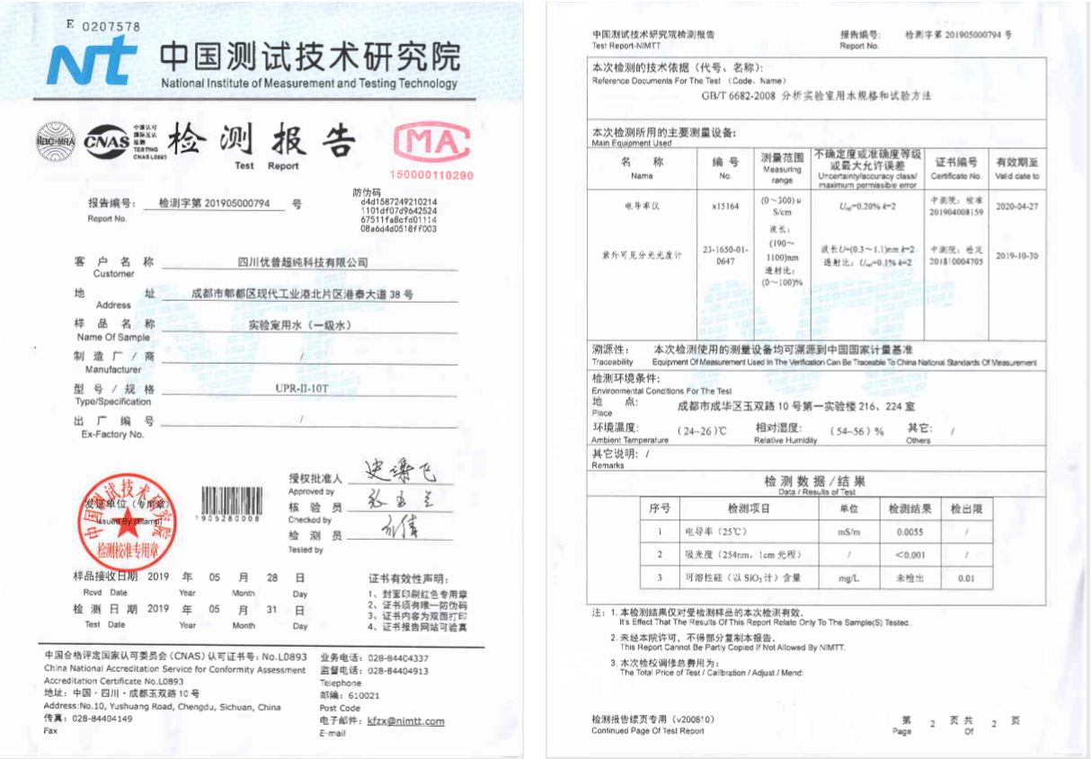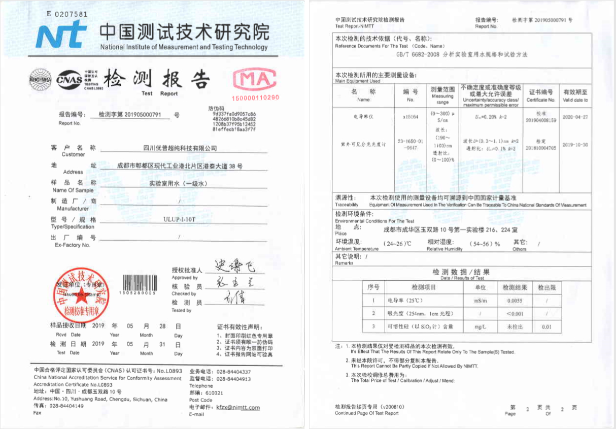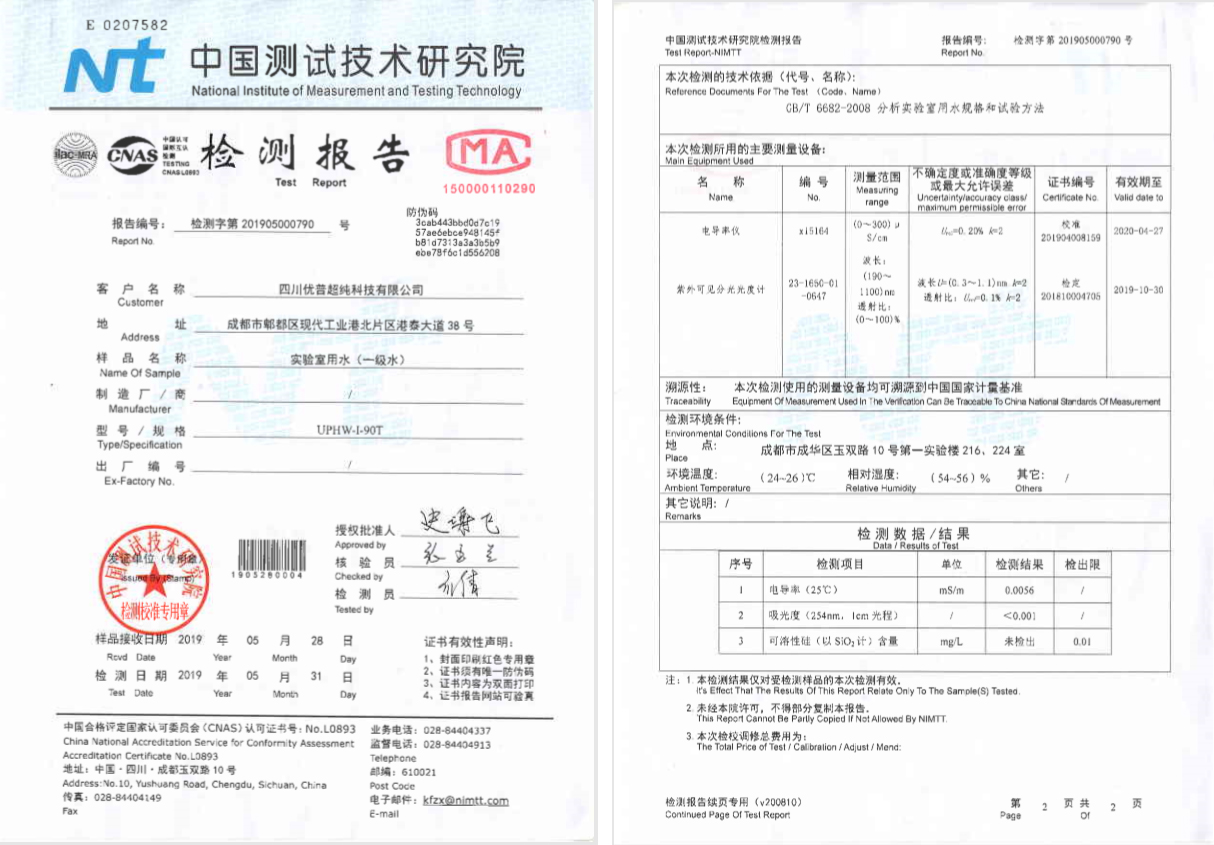 •        【快訊】近日,四川優(yōu)普超純科技有限公司針對(duì)旗下實(shí)驗(yàn)室、醫(yī)療純水機(jī)/超純水機(jī):UPHW-I-90T、ULUP-I-10T、UPS-I-10TNP、UPH-I-20T、UPR-II-10T五種機(jī)型在中測(cè)院做了水質(zhì)檢測(cè),CIE實(shí)驗(yàn)室儀器水指標(biāo)全部達(dá)標(biāo)。