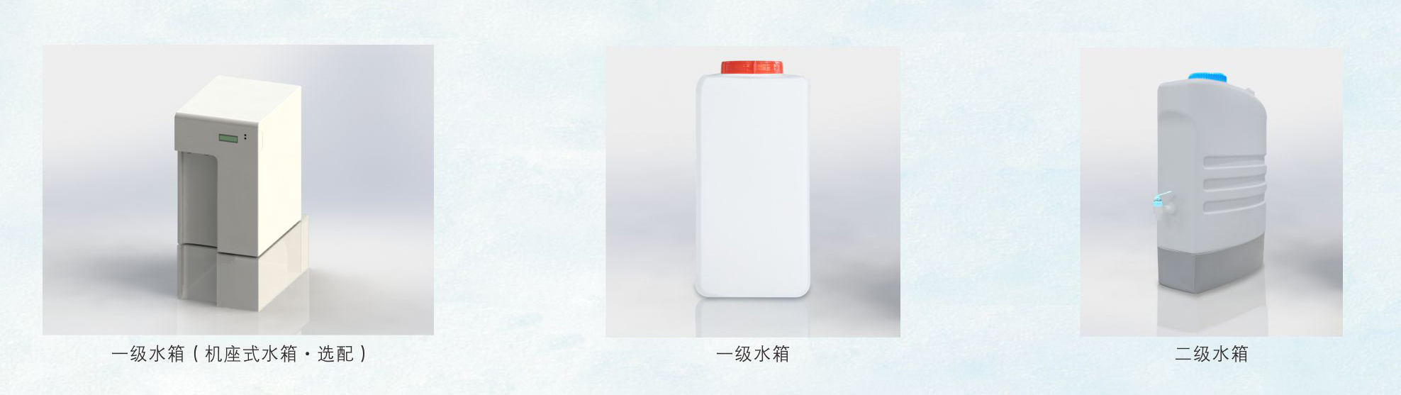TNP機(jī)型一級(jí)水箱標(biāo)配20升PE水箱,TNZP機(jī)型無(wú)一級(jí)水箱。所有機(jī)型二級(jí)水箱標(biāo)配ULUPURE水箱(一級(jí)水箱選配機(jī)座式,特點(diǎn):不占空間外形與設(shè)備融為一體)