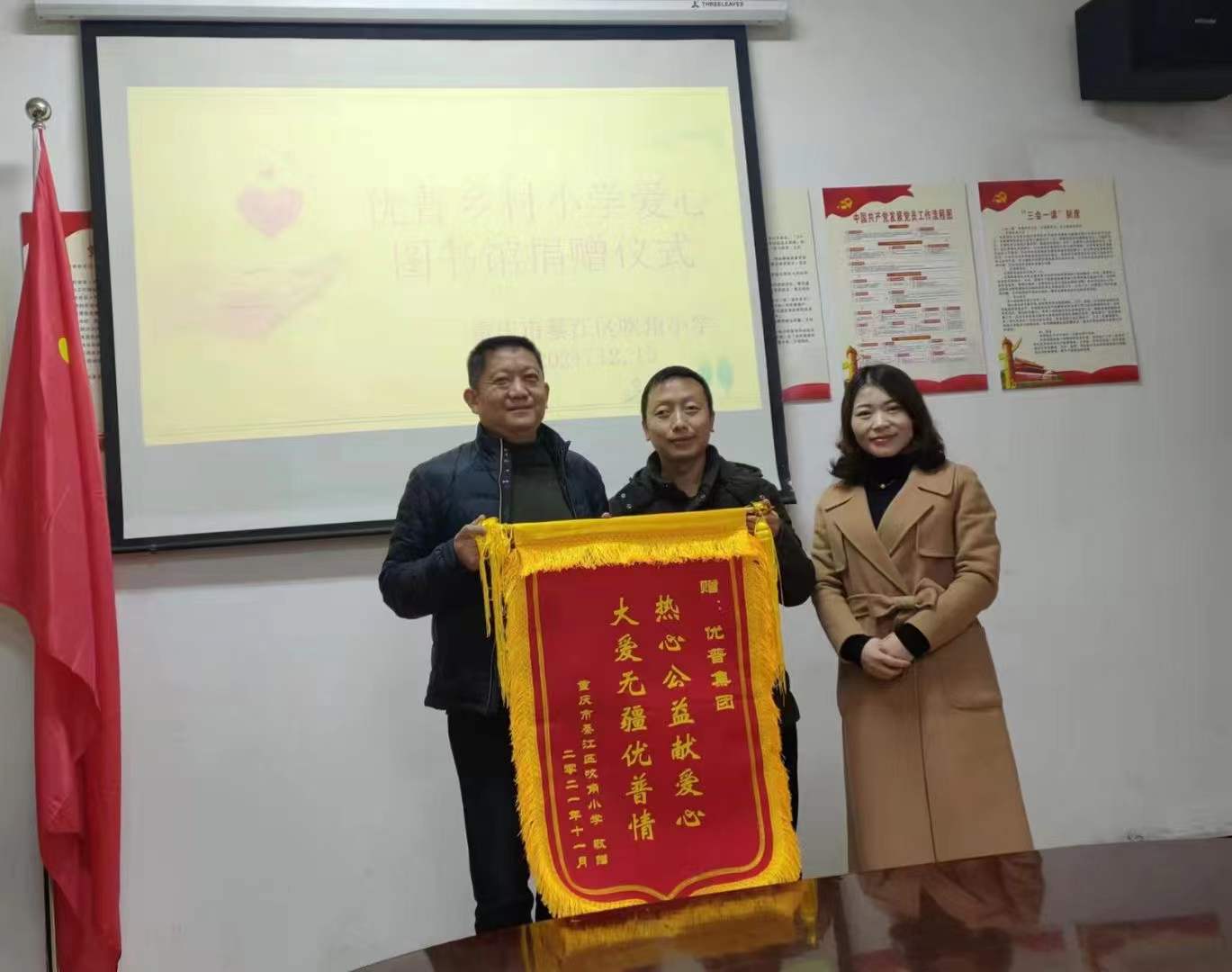 •        “優(yōu)學(xué)有序,普愛無間”,2021年12月15日,優(yōu)普援建的第NO.011所“優(yōu)普鄉(xiāng)村小學(xué)愛心圖書館”在重慶市綦江區(qū)打通鎮(zhèn)吹角小學(xué)落成,優(yōu)普集團(tuán)總裁詹偉先生授權(quán)副總裁陸剛先生率人力資源總監(jiān)余海英女士、《優(yōu)普視界》編輯羅湘峰先生、人事主管李婷女士等出席掛牌儀式。