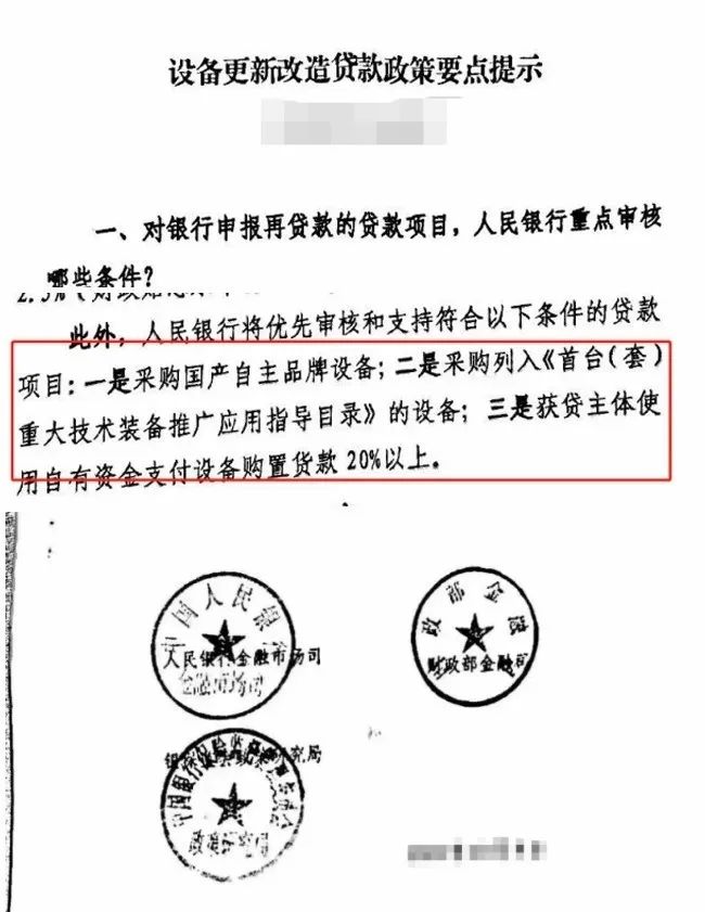 近日,網(wǎng)傳業(yè)內(nèi)流出一份《設(shè)備更新改造貸款政策要點(diǎn)提示》文件,明確提出央行對(duì)設(shè)備更新改造專項(xiàng)再貸款項(xiàng)目重點(diǎn)審核條件。據(jù)文件截圖信息,人民銀行將優(yōu)先審核和支持符合以下條件的貸款項(xiàng)目:一是采購(gòu)國(guó)產(chǎn)自主品牌設(shè)備;二是采購(gòu)列入《首臺(tái)(套)重大技術(shù)裝備推廣應(yīng)用指導(dǎo)目錄》的設(shè)備,三是獲貸主體使用自有資金支付設(shè)備購(gòu)置貨款20%以上。