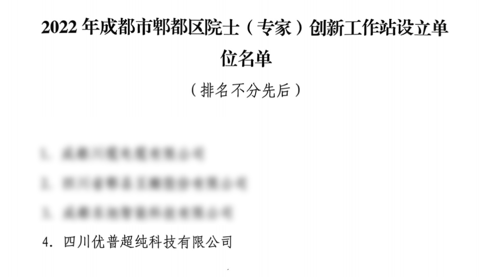 近日,經(jīng)成都市郫都區(qū)區(qū)委組織部(人才辦)、區(qū)委統(tǒng)戰(zhàn)部(校地辦)、區(qū)財政局、區(qū)人社局、區(qū)新科局、區(qū)科協(xié)等六個部門綜合評審,同意四川優(yōu)普超純科技有限公司(以下簡稱“優(yōu)普”)設立“成都市郫都區(qū)院士(專家)創(chuàng)新工作站。