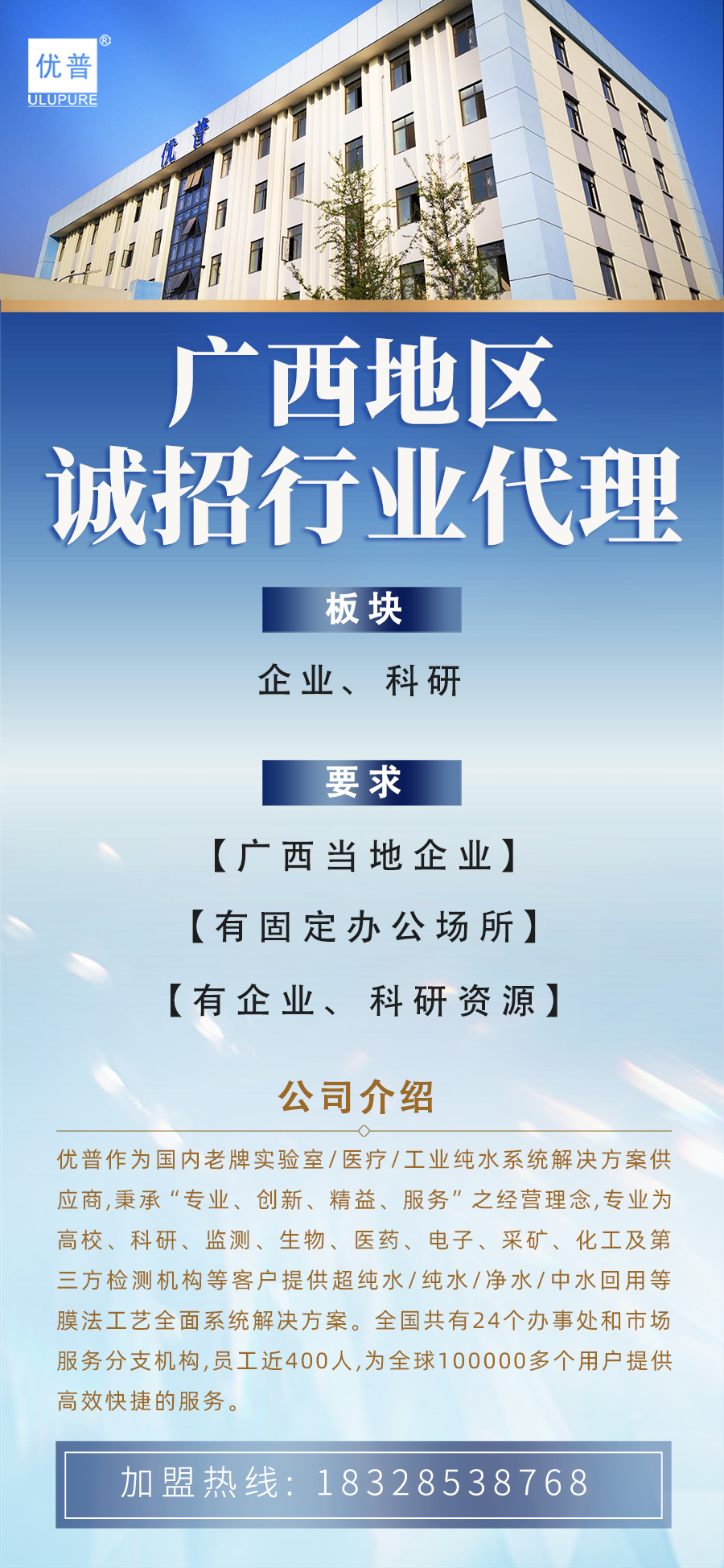 優(yōu)普作為國(guó)內(nèi)老牌實(shí)驗(yàn)室/醫(yī)療/工業(yè)純水系統(tǒng)解決方案供應(yīng)商,秉承“專業(yè)、創(chuàng)新、精益、服務(wù)”之經(jīng)營(yíng)理念,專業(yè)為高校、科研、監(jiān)測(cè)、生物、醫(yī)藥、電子、采礦、化工及第三方檢測(cè)機(jī)構(gòu)等客戶提供超純水/純水/凈水/中水回用等膜法工藝全面系統(tǒng)解決方案。全國(guó)共有24個(gè)辦事處和市場(chǎng)服務(wù)分支機(jī)構(gòu),員工近400人,為全球100000多個(gè)用戶提供高效快捷的服務(wù)。
