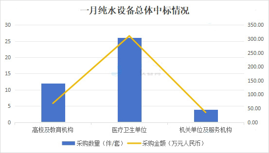 結(jié)合“2024年1月各類型單位采購(gòu)純水設(shè)備金額占比”與“2024年1月各類型單位采購(gòu)純水設(shè)備數(shù)量占比”和“2024年1月純水整體中標(biāo)情況”三項(xiàng)數(shù)據(jù)來(lái)看,醫(yī)療衛(wèi)生單位依舊是1月純水的采購(gòu)主力,在采購(gòu)數(shù)量和采購(gòu)金額上表現(xiàn)突出,其次是以大學(xué)為代表的教育機(jī)構(gòu)。