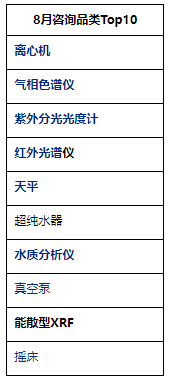 8月份,采購的儀器品類分布較廣,覆蓋品類達到千余個,8月份咨詢量Top10中的品類,有7類在7月份依然熱門,8月榜單中,分析儀器與實驗室常用設備各占5席。