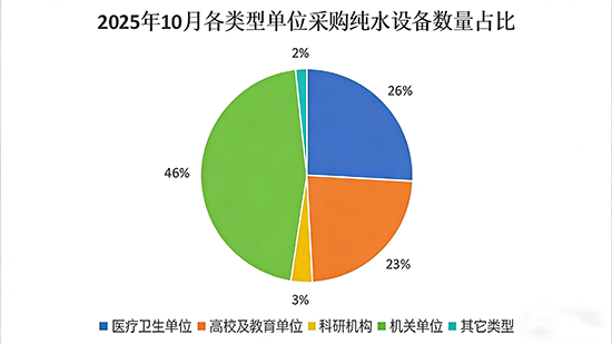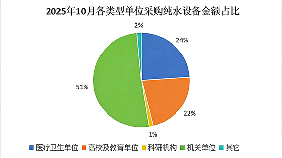 根據(jù)不完全統(tǒng)計(jì),10月醫(yī)療衛(wèi)生單位采購純水設(shè)備32套/臺,采購數(shù)量占比25.81%,采購金額達(dá)315.3472萬元,占中標(biāo)總金額的23.94%;高校及教育單位采購純水設(shè)備29套/臺,采購數(shù)量占比達(dá)到了23.39%,采購金額達(dá)292.91萬元,占中標(biāo)總金額的22.24%;科研機(jī)構(gòu)采購純水設(shè)備4套/臺,采購數(shù)量占比達(dá)到了3.23%,采購金額達(dá)17.57萬元,占中標(biāo)總金額的1.33%;機(jī)關(guān)單位采購純水設(shè)備57套/臺,采購數(shù)量占比達(dá)到了45.97%,采購金額達(dá)673.27萬元,占中標(biāo)總金額的51.12%;其它類型單位采購純水設(shè)備2套/臺,采購數(shù)量占比達(dá)到了1.61%,采購金額達(dá)17.93萬元,占中標(biāo)總金額的1.36%。