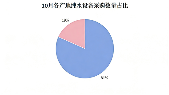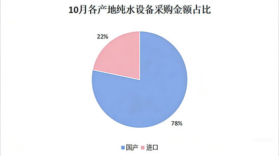 從“10月各產(chǎn)地純水設(shè)備采購數(shù)量占比”及“10月各產(chǎn)地純水設(shè)備采購金額占比”兩項(xiàng)數(shù)據(jù)來看,無論是數(shù)量還是總價(jià),國產(chǎn)純水設(shè)備的市場占有率都更高,且國產(chǎn)設(shè)備開始進(jìn)一步發(fā)力。