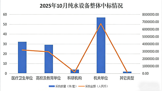 結(jié)合“2025年10月各類型單位采購純水設(shè)備金額占比”與“2025年10月各類型單位采購純水設(shè)備數(shù)量占比”和“2025年10月純水設(shè)備整體中標(biāo)情況”三項(xiàng)數(shù)據(jù)來看,機(jī)關(guān)單位采購純水設(shè)備的數(shù)量最多,達(dá)到了57套/臺,并且采購總金額要明顯高于其它類型的采購單位。其中,來自海關(guān)單位的采購多達(dá)45套/臺,而從采購項(xiàng)目名稱及采購需求明細(xì)等信息來看,造成這種情況的一個(gè)重要原因是“兩新”政策的持續(xù)推進(jìn)。