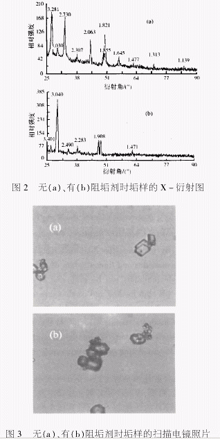 當(dāng)系統(tǒng)的硬度、堿度較高,所投人的鰲合劑、分散劑不足以完全阻止它們析出的時(shí)候,它們就不可避免地析出。如果沒有分散劑的存在,垢的生長(zhǎng)將服從晶體生長(zhǎng)的一般規(guī)律,所形成的垢堅(jiān)固地附著在熱交換器表面上。如果有足量的分散劑的存在,由于成垢粒子(由成百上千個(gè)CaCO3分子組成)被分散劑吸附、包圍,阻止了成垢粒子在其規(guī)則的晶格點(diǎn)陣上排列,從而使所生成的污垢松軟、易被水流的沖刷而帶走。投加與不投加分散劑時(shí)所形成的垢樣的X-衍射圖和電子掃描電鏡照片如圖2、圖3所示。