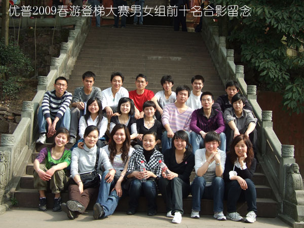 在進(jìn)入景點(diǎn)伊始的位置,公司策劃組織了跨越二千余級(jí)臺(tái)階的“登梯大賽”,這是體力真實(shí)的較量與毅力真正的比拼,更是我們優(yōu)普精神的形象寫真——男女兩組在公司總裁的一聲令下,猶如狂瀉千里的洪水,轉(zhuǎn)眼就消失在了蒼翠的林間…一路上“加油”聲不斷,綿延至比賽的終點(diǎn)…經(jīng)過不到20分鐘的揮汗如雨,男女兩組的前十名都在震耳欲聾的“加油”聲中悉數(shù)產(chǎn)生: